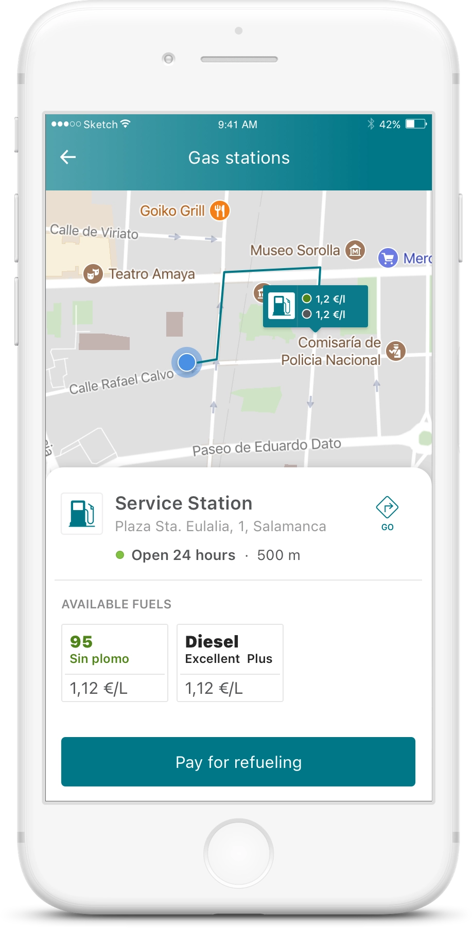 Select on the map the Service Station where you want to refuel, the type of fuel for your vehicle and the amount of fuel you need. Confirm the payment on the next screen and you now have your voucher with the refuelling code.